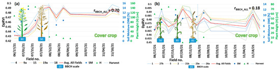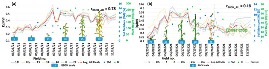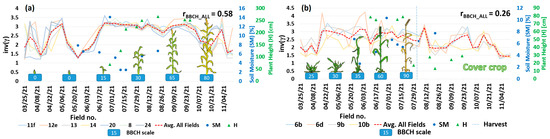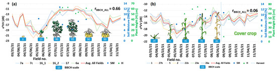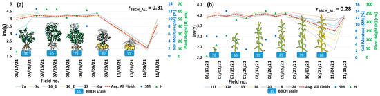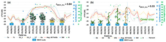 In the case of vegetation height, the correlation is moderate-to-small. Only for corn, the correspondence between and vegetation height is strong (r = 0.81). However, for some species, appeared to outperform (e.g., winter wheat, rye) but the correlation is still low (r ≈ 0.3/0.4).