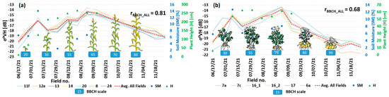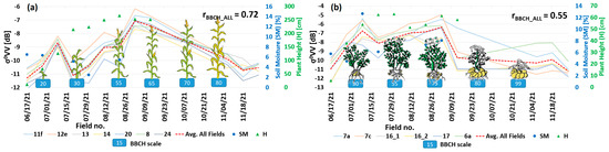 From 27 March 2021 to 21 September 2021, a total of 18 field visits were conducted to gather information about the phenology development as well as soil moisture. These visits were scheduled to align as closely as possible with the anticipated flights of the Sentinel-1 or TerraSAR-X/TanDEM-X satellites. The collected data were then used to verify the actual correlation between the RS radar signal and the derived vegetation indices. Vegetation height measured by tape, phenology development phase in BBCH scale, as well as soil samples were captured to estimate soil water content by field sampling and laboratory analysis. The Biologische Bundesanstalt, Bundessortenamt and CHemical (BBCH) is a widely used scale applied to phenology characterization of a wide range of crops [30]. This scale can be described as a two-digit decimal coding system used to describe the development of monocotyledonous and dicotyledonous plants. It employs 10 major phases (0–9), which are further separated into 10 smaller stages of development (0–9) [31].