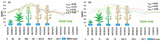 Pearson correlations were calculated for time series between data captured in the field and time series indices delivered from the SAR dataset. However, due to the limited number of TSX data, tracking phenological stages was carried out for a limited period, compared with S-1. Therefore, r was calculated in two manners; first, with long time series of S-1 datasets, and secondly for shortened time series restricted by dates of TSX acquisition.