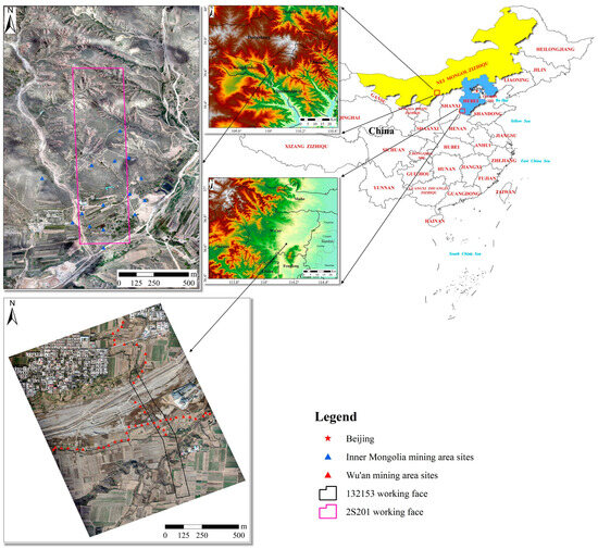 Figure 1 is a schematic diagram of the two mining area locations. The first mining area is located southeast of Wu’an City. Wu’an City is a county-level city under the jurisdiction of Handan City, Hebei Province. It is located south of Hebei Province and east of the Taihang Mountains and is one of the 58 key coal-producing counties (cities) and one of the four major iron ore-rich bases in China [23]. The territory has more than 20 kinds of minerals such as coal, iron, marble, and bauxite [24], among which coal and iron ore are the most famous with reserves of 2.3 billion tons and 562 million tons, respectively. The overall trend of the terrain is higher in the west and lower in the east, belonging to a hilly landform [25]. The jurisdiction has five fourth-order tributaries (Nanming River, Beiming River, Ming River, Mahui River, and Silt River). Figure 2 shows the land cover classification of the two mining areas, with the selection of land cover types, referencing [26]. There are many types of ground features distributed throughout the mining area, including bare land, cultivated land, artificial buildings, and shrubs, which are widely distributed and dense. The study area is based on the impact of mining on the upper part of the 132,135 working face. The strike length of the working face is 840 m, the dip length is 75 m, the average thickness of the coal seam is 5 m, the dip angle is between 21° and 25°, and the average buried depth is 550 m. The working face was pushed from north to south, and the mining method was fully mechanized top-coal caving mining for inclined longwalls. Mining was officially resumed in February 2018 and stopped in June 2019.