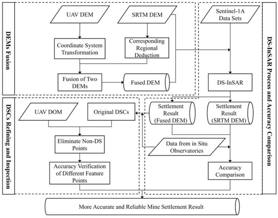 In this study, we used DS-InSAR technology integrated with UAV photogrammetry products to simultaneously process SAR image datasets covering two mining areas in Wu’an and Inner Mongolia. The main technical process (Figure 3) is divided into obtaining fused external reference DEMs; DS-InSAR data processing and accuracy comparison based on fused DEMs; and DSC refinement and verification fused with UAV DOM.