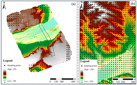 When using elevation correction to convert the elevation system, the elevation value of the UAV DEM of the Wu’an mining area was bound to change due to the mining impact of the corresponding working face. The UAV photographs of the Wu’an mining area were collected on 28 April 2018 and mining started on the corresponding 132,153 working face in February 2018. To ensure the reliability of elevation correction, we evenly distributed sample points from the four corners of the UAV DEM in the Wu’an mining area far from the mining range of the working face, as shown via the black triangle in Figure 4a. The UAV DEM of the Inner Mongolia mining area would not be affected by the mining of the working face. Therefore, we uniformly arranged sample points throughout the entire range, as shown by the black triangles in Figure 4b.
