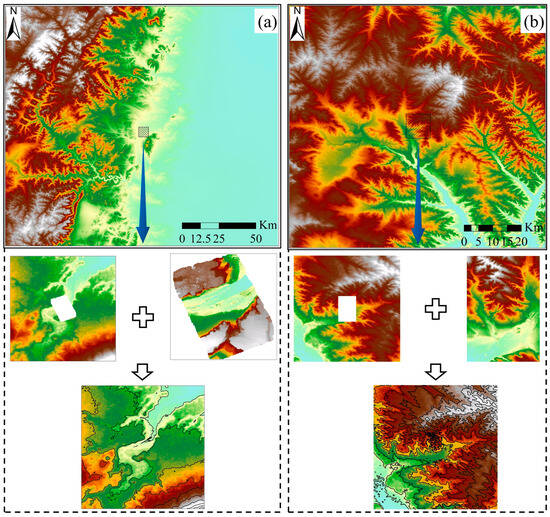 Schematic diagram of DEM fusion. (a) Wu’an mining area; (b) Inner Mongolia mining area.