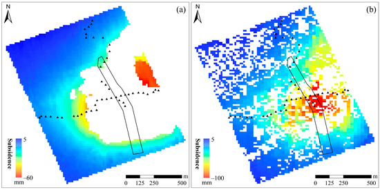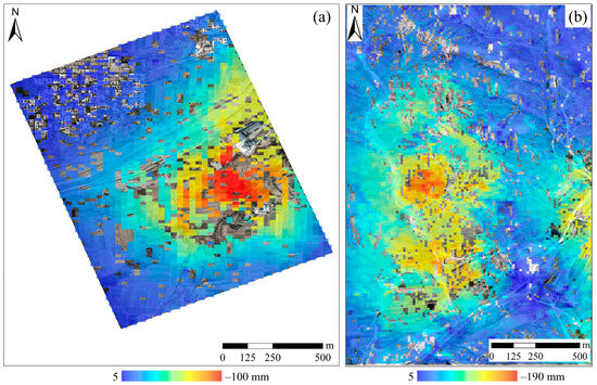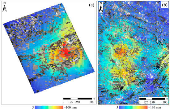 DS-InSAR subsidence results based on the fused DEMs of the Wu’an (a) and Inner Mongolia mining areas (b).