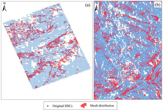 Distribution of original DSCs and shrubs in the Wu’an (a) and Inner Mongolia mining areas (b).
