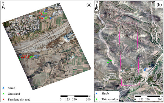 To verify that non-DS points corresponding to land cover types (shrubs in this paper) could affect monitoring accuracy, we compared the monitoring accuracy of different land cover type points using field observation station data from each mining area. We visually interpreted the high-resolution UAV DOM of the two mining areas and extracted three types of ground features from the Wu’an mining area. We used the points in Figure 10b, namely shrubs, grassland, farmland with dirt roads, and ground features, including seven points for shrubs, five points for grassland, and four points for farmland with dirt roads. We also used the K8 and K14 points in Figure 10d and extracted two ground features, namely shrubs and thin grassland (Figure 11).