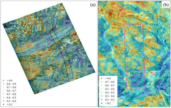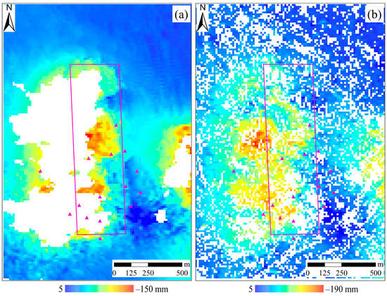 The SBAS-InSAR results (a) and the refined DS-InSAR results (b) of the mining area in Inner Mongolia.