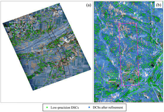 Depending on whether or not there are dominant sub-scatterers in the SAR image resolution unit, ground targets can be divided into permanent and distributed scatterers [33]. The scattering characteristics of DSs are moderate, meaning that there is no backscattering signal from any ground object in the pixel occupying the dominant position of the pixel signal. Common examples in nature include bare land, dirt roads, deserts, and grasslands [34,35,36]. DS extraction from conventional DS-InSAR requires statistical testing based on amplitude or intensity images in the time dimension to determine statistically homogeneous pixels (SHPs) for each pixel. Then, the pixel phase is optimized based on the homogeneity of the target pixel. Finally, the phase optimization quality is evaluated, and the number of homogeneous pixels and temporal coherence thresholds is set to filter out DSs with better coherence and a higher signal-to-noise ratio [37,38]. However, the DS selection of conventional DS-InSAR could negatively impact the accuracy of DS extraction; therefore, some non-DS points were also selected as DSs. We propose a DS selection method that integrates UAV DOM. Based on conventional DS selection, non-DS points can be eliminated based on the high-resolution UAV DOM, which contains rich ground coverage information. The specific steps are as follows: (1) the type of ground coverage on the UAV DOM is determined via visual interpretation; (2) by manually selecting training samples, the maximum likelihood method is used to extract the distribution area of ground objects corresponding to non-DS points on the UAV DOM; (3) the surface object distribution areas of non-DS points through manual visual interpretation are selected; (4) the surface object distribution areas of non-DS points are superimposed with the original DSCs to eliminate non-DS points.