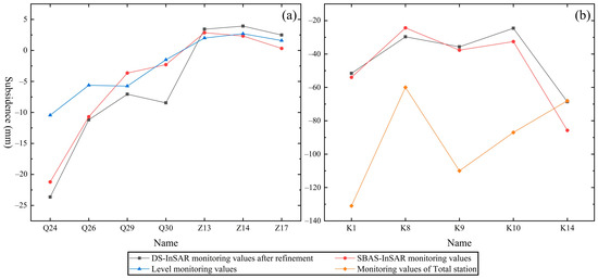 Comparison between SBAS-InSAR and refined DS-InSAR monitoring values in the Wu’an (a) and Inner Mongolia mining areas (b).