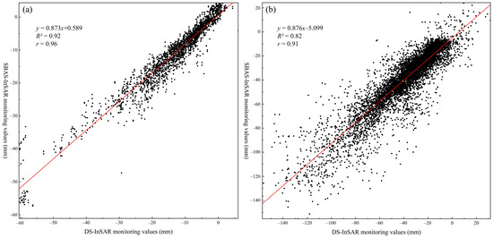 We extracted and compared the SBAS-InSAR and refined DS-InSAR monitoring values for the corresponding locations of the field observation stations in each mining area to the data of the corresponding field observation stations, as shown in Figure 16. Figure 16a,b shows that the SBAS-InSAR monitoring values have the same deformation magnitude and trend as do the refined DS-InSAR monitoring values, and the monitoring accuracy is not significantly different. In addition to comparing the points of a few field observation stations, we also extracted common points from SBAS-InSAR, and refined DS-InSAR results of each mining area and drew them into a scatter density map (Figure 17). Figure 17a,b shows the mining areas of Wu’an and Inner Mongolia, respectively. Pearson’s correlation coefficients (r) for the two mining areas are 0.96 and 0.91, respectively, suggesting that the SBAS-InSAR and refined DS-InSAR monitoring values reached a high degree of coincidence for the two mining areas. In summary, the refined DS-InSAR monitoring results could increase the number and density of target points while ensuring accuracy, thus having greater advantages over SBAS InSAR.