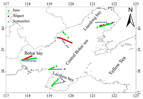 The Bohai Sea is in the western Pacific Ocean, located between 117°38′E and 122°12′E and 37°10′N and 40°51′N. The sea is a semi-enclosed shelf sea with an area of 7.8 × 104 km2, is surrounded by land on three sides, and is divided into four sub-regions: Liaodong Bay, Bohai Bay, Laizhou Bay, and the Central Bohai Sea (Figure 1). The Bohai Sea is shallow, with an average water depth of about 18 m. The deepest (~80 m) area is around the Bohai Strait, which links the Bohai Sea to the Yellow Sea. More than 17 rivers, including the Yellow River, annually contribute 8.0 × 1010 m3 of freshwater to the Bohai Sea; additionally, these rivers annually discharge more than 1.1 × 109 tons of suspended sediment and 6.1 × 109 mol of nitrogen into the sea [20]. These factors make the optical properties of the Bohai Sea complicated and increase the difficulty of satellite remote sensing of the LACA.