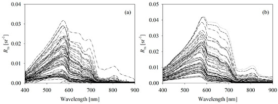 Spectral curves of remote sensing of the two independent datasets: (a) calibration dataset collected from the Bohai Sea in June and August 2005 (99 samples); (b) validation dataset collected from the Bohai Sea in September 2005 (37 samples).