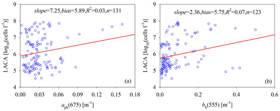 Scatterplots of the LACA versus inherent optical properties: (a) absorption of chlorophyll-a concentration at 675 nm versus the LACA; (b) backscattering coefficient at 555 nm versus the LACA.