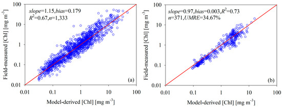 Scatterplots of field-measured and model-predicted [Chl]: (a) model initialized with data collected from the Yellow Sea, the East China Sea, and SeaBASS; (b) model evaluated using data collected from the Bohai Sea and the West Florida Shelf.