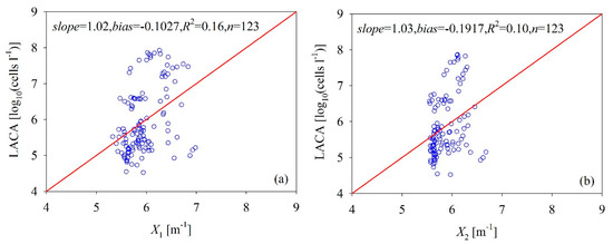 Scatterplots of inherent optical properties-estimated versus measured LACA from the Bohai Sea, where X1 and X2 represent 0.5935[a(412) + 0.754a(443) + 1.560a(488) − 2.418a(555)]0.114 and 6.626[bb(443) − 0.292bb(488)]. The empirical formulae in the x-axis are regressed to the field measurements.