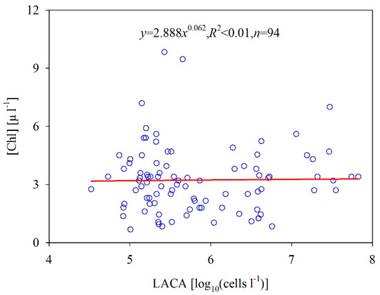 The absorption of [Chl] and gelbstoff can be analytically separated from the total absorption [36] if the a(λ) values are known for at least two wavelengths. Therefore, if the optical properties of algal cells strongly depend on the optical properties of phytoplankton pigment, the LACA should strongly relate to the band combination of a(λ) at visible bands. However, the results in Figure 5a show that the relationship between the LACA and the band combination of a(λ) was poor, with an R2 of only 0.16. Moreover, to illuminate the effects of algal cells on the backscattering coefficient, we present the relationship between the LACA and the band combination of bb(λ) (Figure 5b). Like the results in Figure 5a, the LACA values do not significantly depend on bb(λ) (R2 = 0.10). The phytoplankton pigment in a cell is subject to perturbations in their size and to environmental conditions. To maintain productivity, the phytoplankton must develop adaptive strategies which fit and compensate for environmental changes [37]. Figure 6 shows that [Chl] increases as the LACA increases according to the slope coefficient of the linear relationship between the two variables, but there is no statistically significant relationship between them (R2 < 0.01, p < 0.001). The weak relationship between [Chl] and LACA is primarily due to phytoplankton size structure, nutrients, solar irradiance, and other physical forces [38]. These results further confirm that it is challenging to accurately and semi-analytically derive the LACA from ocean color products due to the complicated optical behavior of algal cells.