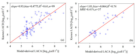 Scatterplots of the field-measured “Known” and satellite-derived LACA on a logarithmic scale.