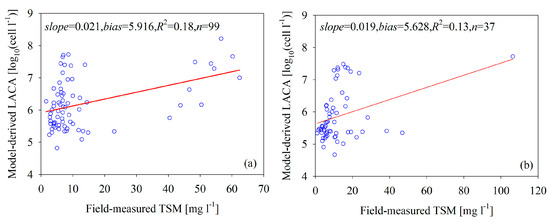 Scatterplots of the NNL-estimated LACA versus the in situ TSM concentration: (a) calibration data and (b) validation data.