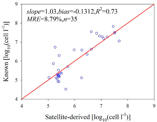 We quantified the NNL model-derived LACA data from the MODIS data after atmospheric correction using the improved shortwave infrared method. We evaluated the accuracy of our predicted LACA by comparing the satellite products with synchronous field measurements. We used four MODIS images synchronized with in situ measurements for our match-up comparison. Figure 9 shows the satellite-predicted LACA plotted against the synchronous in situ data measured within ± 3 h of the satellite pass over the Bohai Sea. For the LACA values that range from 4.522 to 7.825 log10 (cells L−1), the relative uncertainty of the prediction is lower than 25.32%, with an average of 8.79%. The slope and bias are 1.03 and −0.302, respectively, and the R2 = 0.73. Therefore, the NNL model accurately retrieved the LACA from the satellite data even though the ocean color satellite data were significantly influenced by colored dissolved organic matter (CDOM) and suspended sediments in the turbid coastal waters of the Bohai Sea, which, in turn, influenced the ACA retrievals. We suggest that if an atmospheric correction scheme for MODIS bands is available, the MODIS data could be used for quantitatively detecting the LACA from turbid waters.