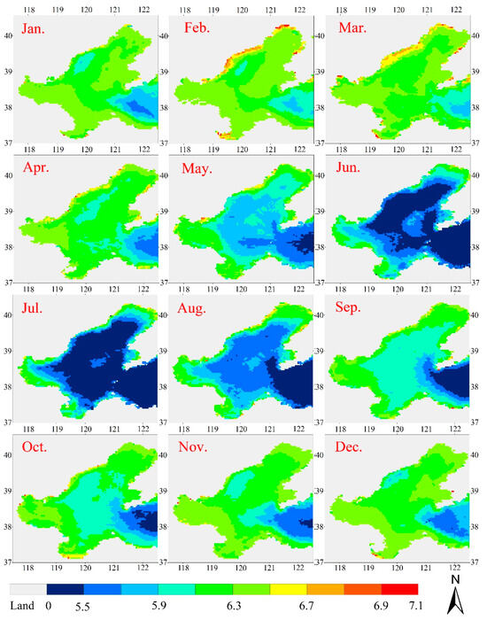 The NNL model predicted a climatological monthly mean of ACA for the MODIS Rrs data between July 2002 and February 2015. Figure 10 shows that ACA varies largely from 104 to 107.1 cells/L. As expected, the low values were over the outer shelf and the high values were over the coastal zones, which is consistent with the spatial distribution of commonly used optical activity components for this region [40,41]. From the shoreline to the central Bohai Sea, ACA decreased as the offshore distances increased. The highest ACA values occurred in the waters around Bohai Bay, Laizhou Bay, and Liaodong Bay, where there was ACA over 106 cells/L. These high ACA values are due to the strong mixing that carries sufficient nutrients toward the surface and, in turn, produces more phytoplankton cells. In addition, the strong mixing brings significantly high concentrations of suspended particles towards the surface.