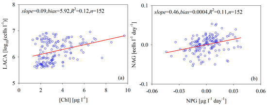 In addition to nutrient concentration, light, phytoplankton size structure, and temperature variation are important physical forcing factors for efficient phytoplankton photosynthesis [45], which, in turn, affects the relationship between [Chl] and ACA. The physical forcing factors in the Bohai Sea are seasonal and have spatially changing patterns [46], which make the relationship between [Chl] and ACA very weak (Figure 11a). This fact is similar to the conclusion we draw from the field measurements shown in Figure 6. It is interesting to point out that NAG rates also increase as NPG rates increase (Figure 11b), despite the low correlation between the two rates (R2 = 0.11, n = 152). On the one hand, the physical process of algal cell growth is different from [Chl] growth. Specifically, when one mother cell divides into two daughter cells, the NAG rate changes but [Chl] might remain the same. In the same argument, the changes in [Chl] would not lead to the algal cell division unless the algal cells were big enough and the nutrients were sufficient enough. On the other hand, the intracellular [Chl] always depends on solar irradiance, provided nutrients, phytoplankton structure size, and other factors. Especially for microplankton (size > 20 μm), the size structure of phytoplankton controls the ratio of [Chl] to ACA [9]. Therefore, it is hard to describe the relationship between ACA and [Chl] using a simple mathematical function for a complex aquatic ecosystem such as the Bohai Sea.