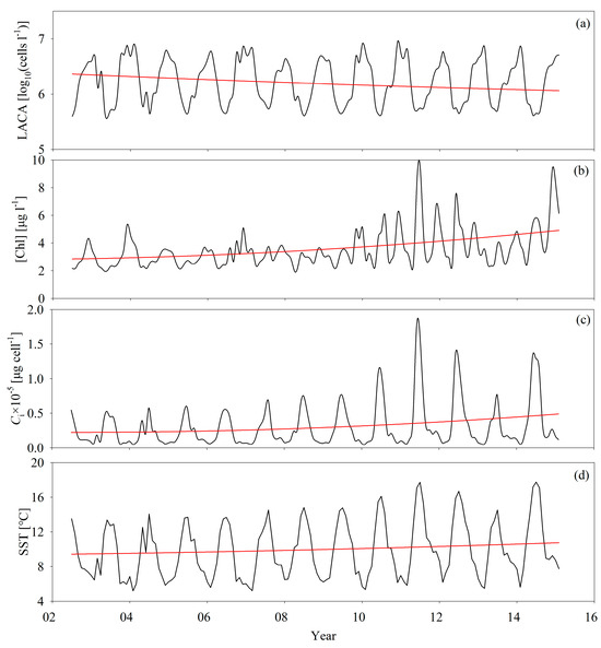 Time series of (a) ACA, (b) [Chl], (c) Ci, and (d) SST from 2002 to 2015: the black line represents the original data and the red line shows the changing trends extracted using the Hilbert-Huang transform proposed by Huang et al. [47].