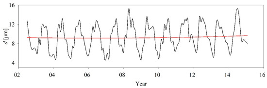 Time series of algal cell diameter from 2002 to 2015: the black line represents the original data and the red line shows the changing trends extracted using the Hilbert-Huang transform proposed by Huang et al. [47].