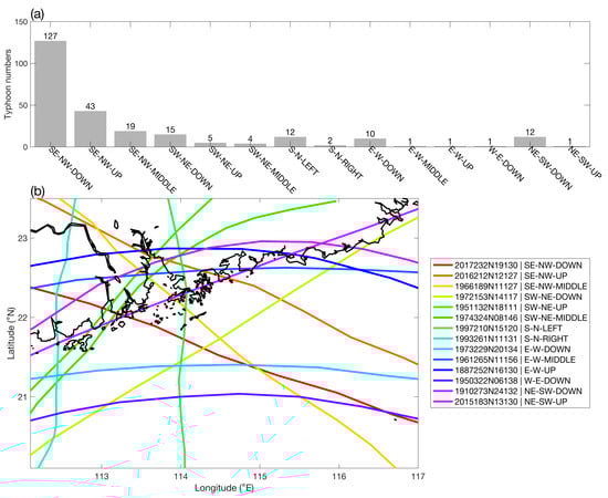 (a) Statistics of tropical cyclones striking Pearl River Estuary with different tracks. (b) Representative cyclone track of each kind.