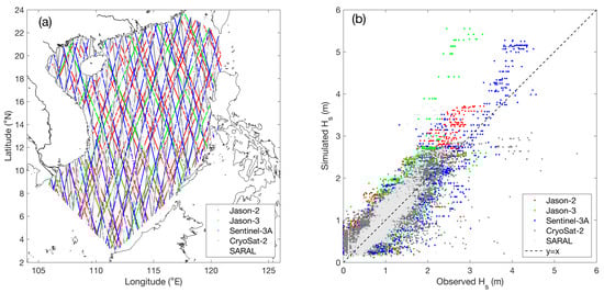 (a) Ground tracks of Jason-2, Jason-3, Sentinel-3A, CryoSat-2, and SARAL in the study domain during 1–31 August 2017. (b) Comparisons between observed and modeled (data from Uncoupled case) significant wave height of different satellites.