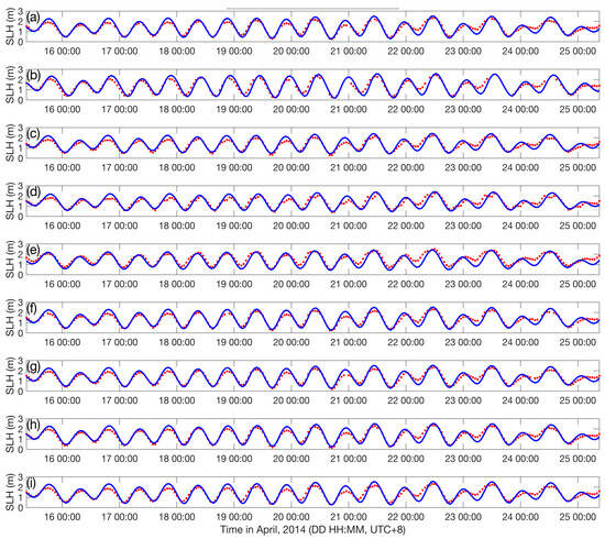 (a–i) show the comparisons between observed sea level height and modeled result at tide stations T1–T9 shown in Figure 1c, successively.