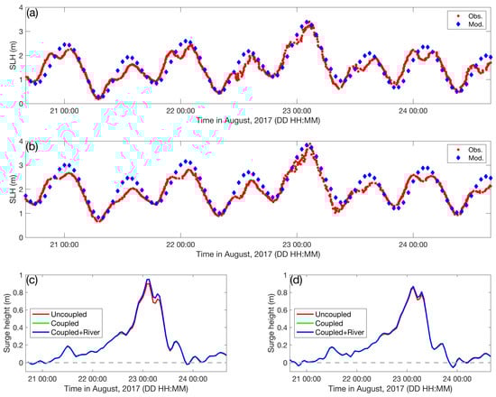 (a,b) show the comparisons between observed sea level height and modeled result (Coupled + River case) at tide stations T10 and T11 shown in Figure 1c during the strike of super typhoon Hato (2017), respectively. (c,d) display time series of surge height simulated using different numerical cases at stations T10 and T11, respectively.