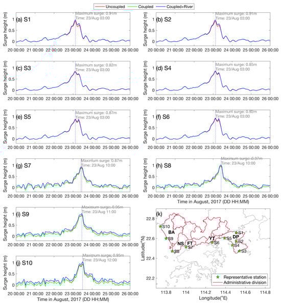(a–j) show the time series of surge height at representative stations S1–S10 along the coastal districts of Shenzhen city; locations of representative stations are shown in (k). Abbreviations DP, YT, FT, NS, and BA denote Dapeng, Yantian, Futian, Nanshan, and Baoan coastal districts of Shenzhen city, respectively.