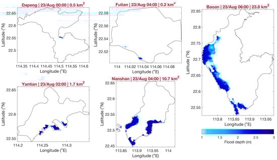 The inundation area of districts inside the Pearl River Estuary was generally broader than those outside the estuary. Meanwhile, the most and second severe flooding occurred in Baoan and Nanshan, with inundation areas of 23.8 and 10.7 km2, respectively. Compared with Baoan and Nanshan, the flooding in Futian, Dapeng, and Yantian was much weaker, and the inundation area was about one order of magnitude smaller than the former ones.