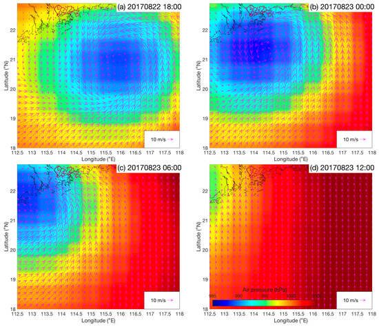 (a–d) show 10 m wind vectors superposed on sea surface air pressure (data originated from CFSv2 product) at 18:00 22 August, 00:00 23 August, 06:00 23 August, and 12:00 23 August 2017, respectively. Administration division borders of Shenzhen are marked in dusky red.