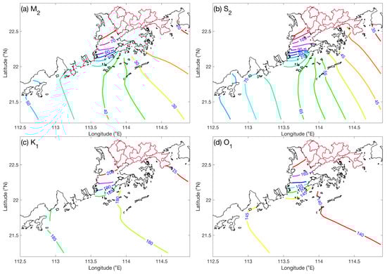 (a–d) show tidal phases of M2, S2, K1, and O1 constituents in the study domain, respectively. Administration division borders of Shenzhen are marked in dusky red.
