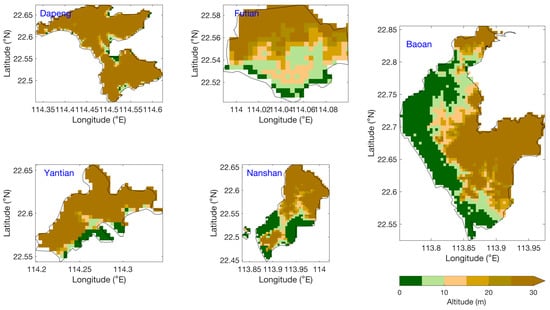 Altitude of the coastal districts of Shenzhen city: Dapeng, Yantian, Futian, Nanshan, and Baoan, respectively.