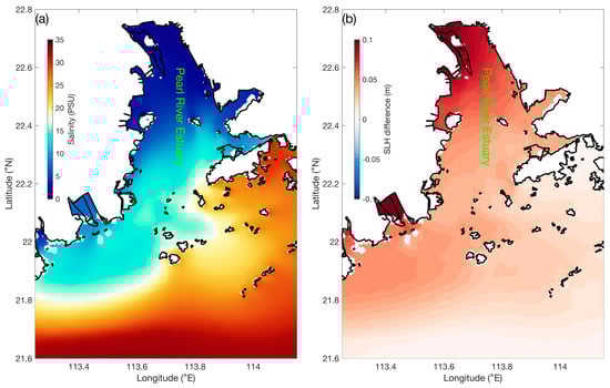 In terms of river discharge, Pearl River is the second largest river in China, with an annual average flux of , which is a dominant factor for the ocean biogeochemical environment in the estuary and its adjacent seas. A strong salinity front is one of the most typical phenomena triggered by continuously incoming fresh water (Figure 12a). In Section 3.5, a significant increase (0.11 m) in surge height by the river discharge was found inside the estuary. Therefore, we examined the SLH difference between the Coupled and Coupled + River numerical cases before the strike of Hato, and the result is displayed in Figure 12b. The intervention of Pearl River discharge elevated SLH by ~0.1 m in the estuary but ~0 m in the far field, which well explains the spatial difference of river discharge’s contribution (Figure 7 and Figure 12b).