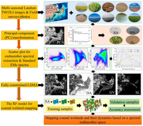 We developed a novel detailed coastal wetland classification framework using Landsat images in a multi-seasonal spectral EM space (Figure 2). Initially, we employed principal component (PC) transformation on multi-seasonal remote sensing images to identify dimensions of the spectral mixing space and define spectral EMs. Subsequently, considering the seasonal variation in different EMs, we determined the purest pixel using the vertex of the polygonal scatter diagram, calculating the average reflectance of the EM pixel as the standard EM spectrum. Following this, a fully constrained LSMA model was applied using the four-EM standard spectral library to acquire spectral EM fraction images. Lastly, utilizing the multi-seasonal spectral EM fraction images, we employed the random forest (RF) model to map detailed coastal wetlands spanning from 1991 to 2020.