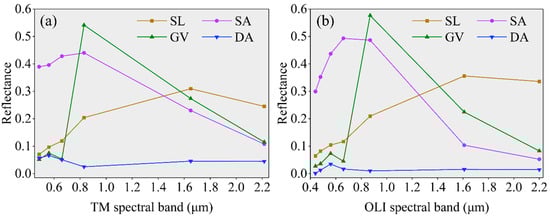 The standard spectra of four EMs, including bare soil (SL), saline (SA), green vegetation (GV), and dark surfaces (DA). (a) the standard spectra of Landsat-5 TM, (b) the standard spectra of Landsat-8 OLI.