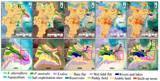 Classification maps of coastal wetlands in the YRD from 1991 to 2020. (a) 1991, (b) 2000, (c) 2008, (d) 2014, (e) 2020, (f) the YRD estuary in 1991, (g) the YRD estuary in 2000, (h) the YRD estuary in 2008, (i) the YRD estuary in 2014, (j) the YRD estuary in 2020.