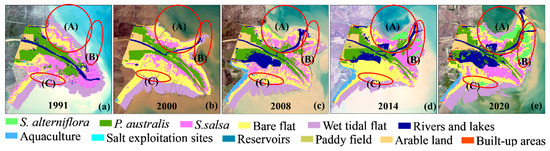 Coastal wetland vegetation in the YRD estuary from 1991 to 2020. (a) 1991, (b) 2000, (c) 2008, (d) 2014, (e) 2020.