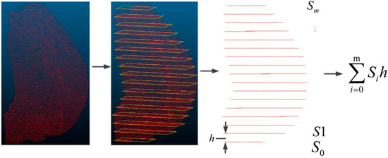 - The volume of the point cloud segments is solved using the slice area and the adjacent slice spacing. The volume V of the overall point cloud is then obtained by summing.