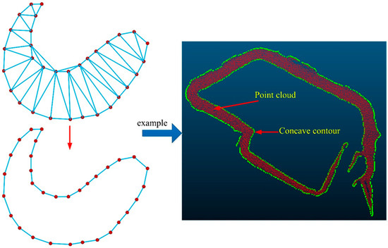 A single contour boundary point after clustering segmentation is a set of unordered point clouds, and subsequent slicing area calculations require ordered contour boundary points. In the traditional slicing method, the two-way nearest point search method is used to sort the contour boundary points and generate the outer contour boundary polygons of the point cloud slices. However, in practical engineering applications, due to the ordering mechanism of the two-way nearest point search method, there is a situation that there is an incorrectly connected edge (its length is too long) between two contour boundaries, i.e., the edge length statistics contains outliers. Therefore, this paper proposes to use the concave hull algorithm [30] to extract its contour boundary and to generate an ordered boundary polygon, as shown in Figure 5. The specific boundary extraction process is as follows: