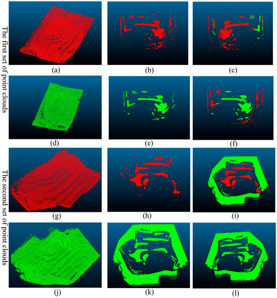 Non-overlapping point cloud extraction results. (a) First phase of the original point cloud in the first group. (b) First phase of non-overlapping point clouds in the first group. (c) Top view of the merging of non-overlapping point clouds in the first group during two periods. (d) Second phase of the original point cloud in the first group. (e) Second non-overlapping point cloud in the first group. (f) Bottom view of the merging of non-overlapping point clouds in the first group during two periods. (g) First phase of the original point cloud in the second group. (h) First phase of non-overlapping point clouds in the second group. (i) Top view of the merging of non-overlapping point clouds in the second group during two periods. (j) Second phase of the original point cloud in the second group. (k) Second non-overlapping point cloud in the second group. (l) Bottom view of the merging of non-overlapping point clouds in the second group during two periods.