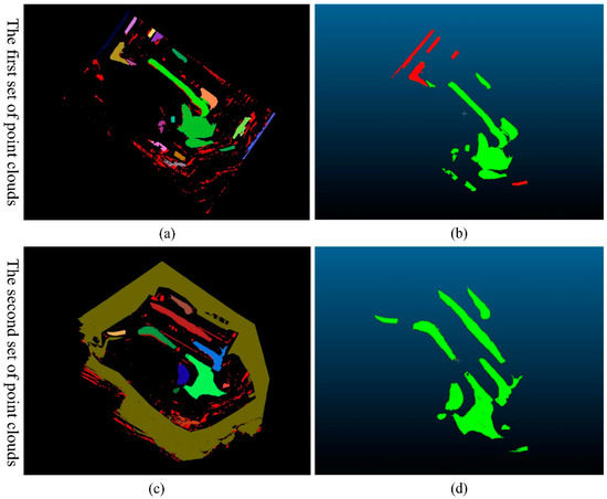 Point cloud preprocessing results. (a) The first group of point cloud classification results. (b) The first group of point cloud denoising results. (c) The second group of point cloud classification results. (d) The second group of point cloud denoising results. It is important to highlight that, within the classification results, as depicted in (a,c), distinct colors have been employed to designate various categories, each corresponding to an autonomous irregular body. In terms of denoising results, as depicted in (b,d), it is evident that there are significantly fewer noise points in comparison to those present in (a,c).