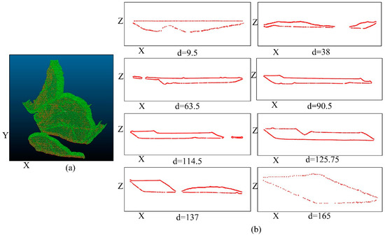 Partial point cloud data and their slicing results. (a) Unsegmented point cloud dataset. (b) Point cloud dataset after slicing in the cutting plane illustrated in (a), showcasing the existence of both single-contour boundaries, as observed at d = 165, and multi-contour boundaries, as evidenced by d = 137.