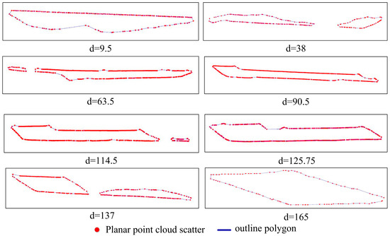 The slicing method is one of the micro-element methods, and the size of the slice spacing not only impacts computational accuracy but also dictates the algorithm’s computational efficiency. Theoretically, a smaller slice spacing yields higher computational accuracy. However, excessively small slice spacing increases algorithmic time complexity, while overly large spacing diminishes computational accuracy. Therefore, in this paper, after conducting multiple experiments and considering both computational accuracy and operational efficiency, we determined the optimal slice spacing to be 0.5 m. Additionally, we employed this spacing to slice the point cloud, resulting in 769 slices. Some outcomes of this process are depicted in Figure 9. Subsequently, the point cloud within each slice was projected onto the middle plane between the two slice planes to extract multiple contour boundaries from the sliced point cloud.