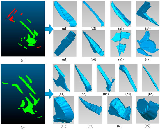 The chosen point cloud data and their respective 3D modeled results. (a) Depicts the first group of point cloud data. (a1–a8) Correspond to the modeled outcomes of the eight subsets of point clouds within (a). (b) Represents the second group of point cloud data. Likewise, (b1–b9) correspond to the modeled outcomes of all irregular bodies within (b).