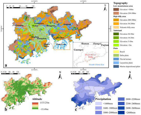 Situated in the central-southern expanse of Guangdong Province, China, the Pearl River Delta shares its borders with the South China Sea. Geographically, it spans longitudinally from approximately 112°0′E to 115°24′E and latitudinally from 21°43′N to 23°56′N, encompassing a land area of 41,698 km2. The region’s topography features a central lowland and elevations that ascend in the northwest and east (Figure 1b). A dominant landform is the alluvial plain, with low mountains, hills, and tablelands distributed across the western, northern, and eastern sectors (Figure 1a). The region’s hydrology is extensive, characterized by river systems such as the Xi River and Dong River, which emanate from mountainous terrains and discharge into the South China Sea. The climatic conditions prevailing in this study area are warm and humid, with an average annual temperature of 21.9 °C. Monsoonal influences lead to pronounced temporal and spatial variations in precipitation, with a concentrated peak during the summer months. The yearly average precipitation amounts to approximately 1600 mm, with certain mountainous locales experiencing levels ranging from 2000 mm to 2600 mm (Figure 1c).