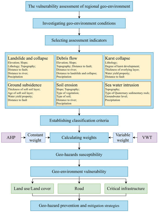 In this study, the assessment of landslide and collapse susceptibility, debris flow susceptibility, karst collapse susceptibility, ground subsidence susceptibility, soil erosion susceptibility, and sea water intrusion susceptibility was carried out utilizing the VWT-AHP method. Furthermore, the assessment of geo-environment vulnerability was conducted by drawing parallels with the principle of the “barrel effect”. Based on the assessment results and considering the distribution of LULC, road construction, and critical infrastructure, recommendations for geohazard prevention and mitigation were provided. The flowchart for this study is depicted in Figure 3.
